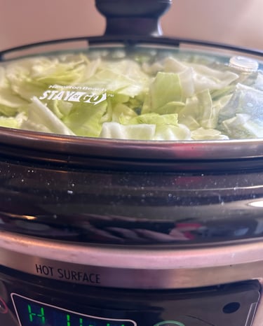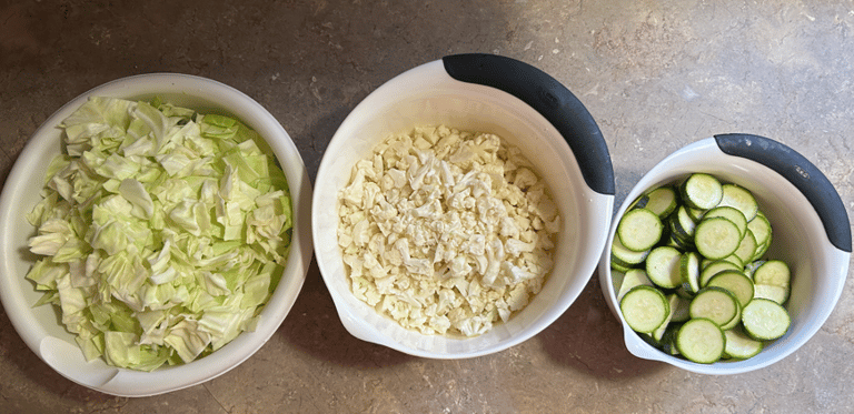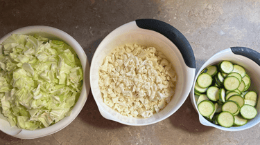 Dice the Zucchini, Cauliflower and cabbage. Keep separate (like pic below). Layer them on top of crock pot (no stirring in): First Zucchini, then Cauliflower, then finally cabbage - keep adding cabbage until fills up to lid essentially.